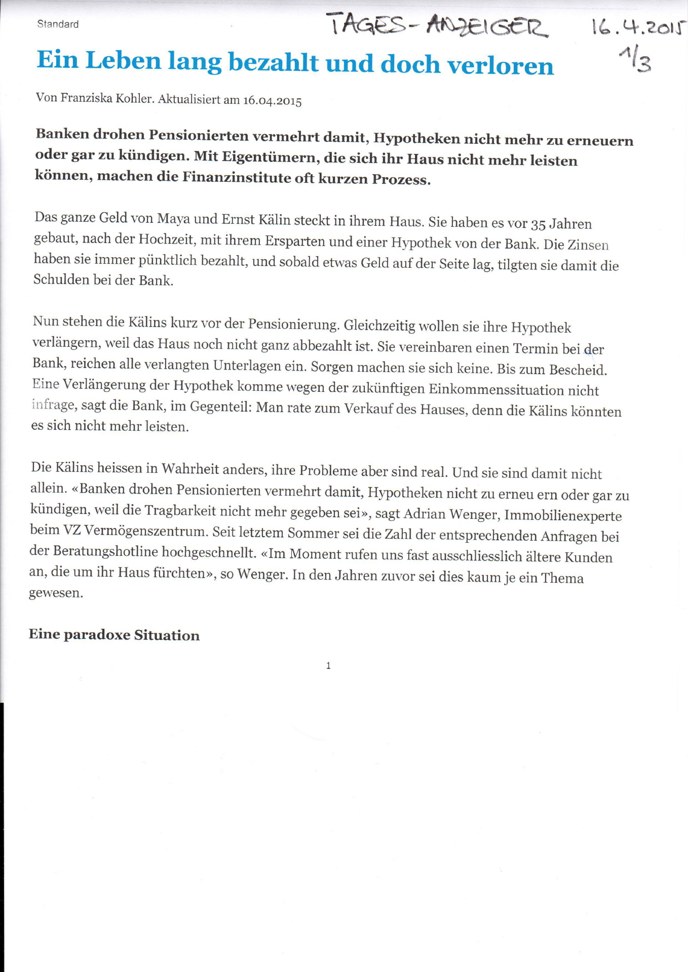 Tages-Anzeiger | Ein Leben lang bezahlt und doch verloren ( Datei)Tages-Anzeiger | Härtere Gangart zu älteren Kreditnehmer ( Datei)