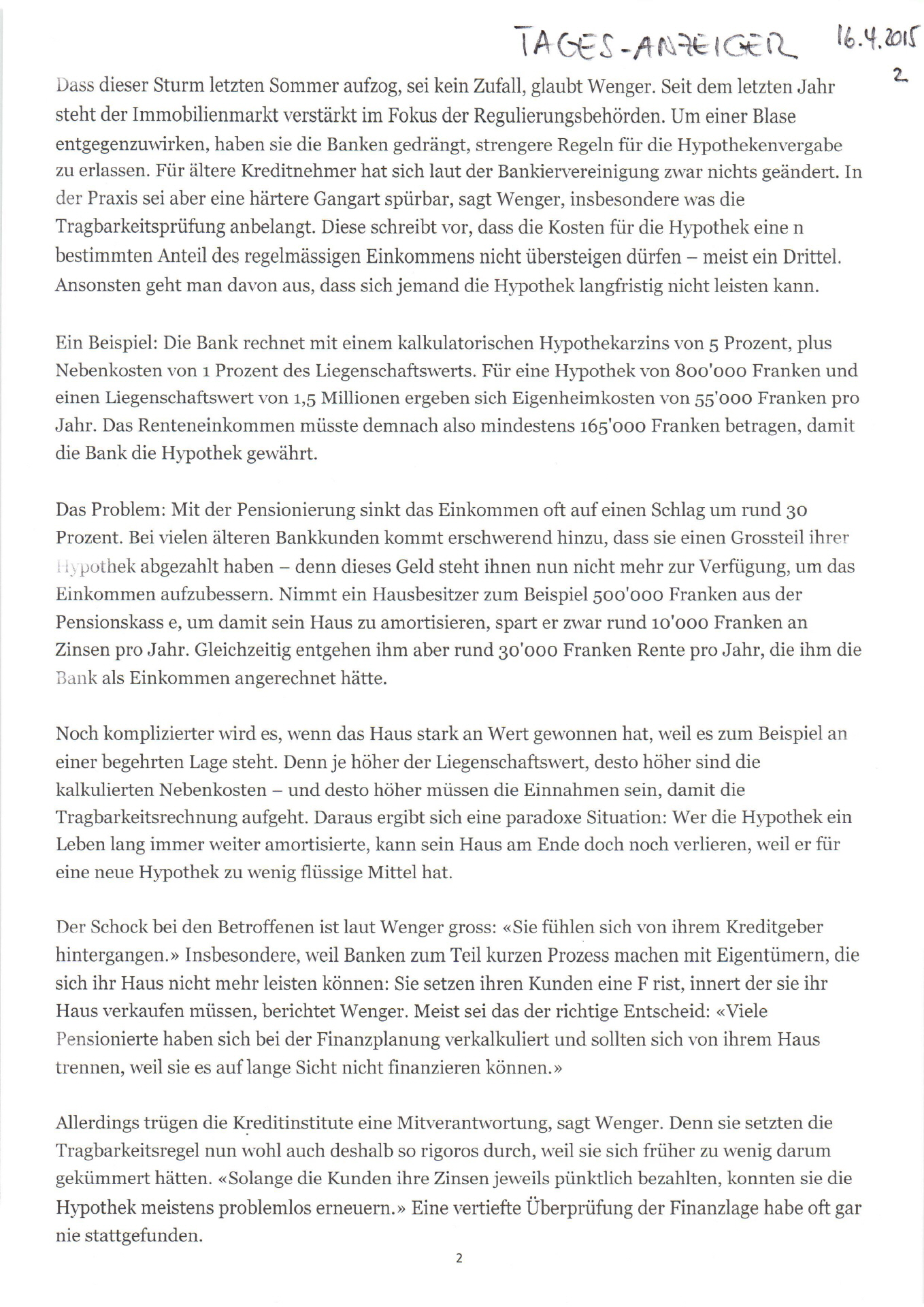 Tages-Anzeiger | Erhalten Hausbesitzer bald Gratishypotheken? ( PDF)