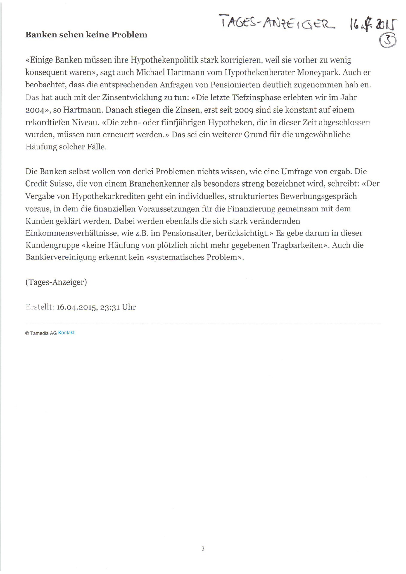 Tages-Anzeiger | Banken sehen keine Probleme ( Datei)